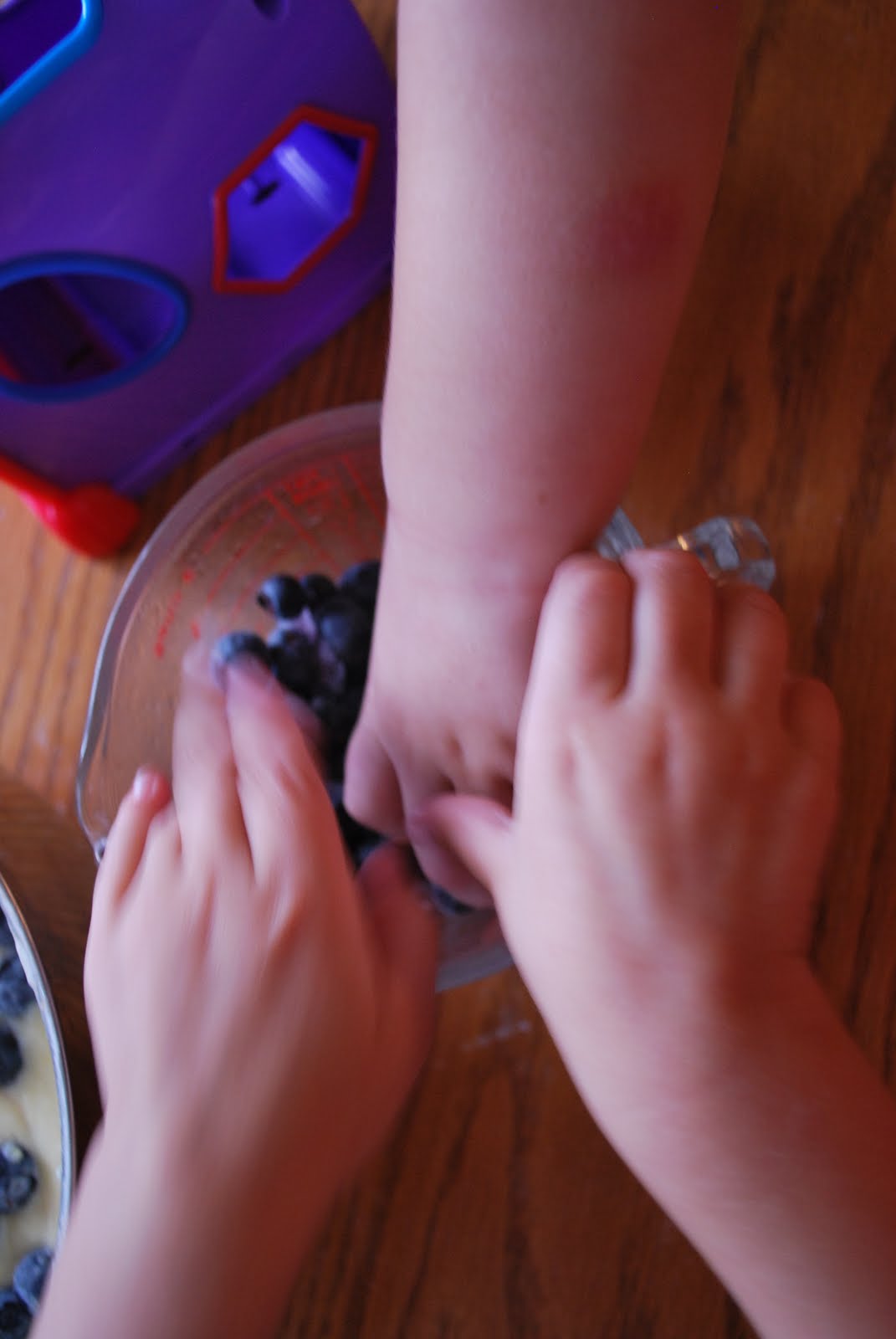 She's a sensitive girl, my little pixie love, and she does things on her own time and her own terms. She withdraws or snaps back when she feels attacked, depending on her mood and the offender. So I decided we needed to do something special, just for us and just to make her feel grown up and bonded with Mommy. She's been begging lately to help with things in the kitchen and we had a lot of frozen blueberries from a co-op basket I bought a few weeks back, so we decided to make some lemon-blueberry bread.